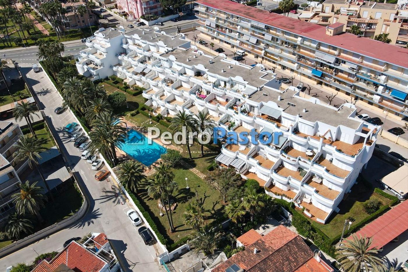 Apartamento de 3 dormitorios y 2 baños en 1ª línea de playa en el km 4 de Las Marinas en Dénia.La vivienda, situada en una primera planta sin ascensor, dispone de orientación Este y cuenta con 95 metros cuadrados de construcción divididos en tres dormitorios con armarios empotrados, dos baños completos con bañera, cocina independiente con galería lavadero y salón comedor con acceso a la terraza, muy amplia, con vistas al mar y a la zona ajardinada y piscina.El apartamento dispone de ventanas de doble acristalamiento, toldos en la terraza, ventiladores de techo en los dormitorios y A/C tipo Split en todas las estancias.Ubicado en una zona muy tranquila, en una bonita urbanización familiar con dos piscinas comunitarias, una de las cuales infantil, ducha exterior, amplia zona ajardinada, a escasos metros de la playa y rodeado todos los servicios como supermercado, gasolinera, restaurantes, parada de bus, farmacia y próximo al consultorio médico.