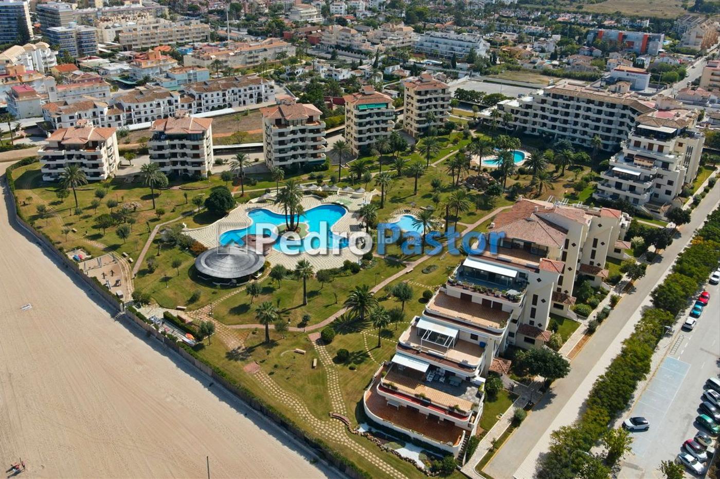 Apartamento de dos dormitorios en primera línea de playa, con acceso directo al mar, ubicado en la urbanización Playa Grande, en el kilómetro 4,5 de Las Marinas, Dénia.La vivienda cuenta con 68 metros cuadrados construidos más una amplia terraza de 20 metros cuadrados, con vistas al mar y a las zonas comunes, orientada al Este, ideal para disfrutar del sol de la mañana.Se distribuye en dos dormitorios con armarios empotrados, el principal con baño en suite y acceso directo a la terraza. Dispone además de un segundo baño completo, un luminoso salón-comedor y una cocina independiente equipada.Ubicado en una cuarta planta con ascensor, el apartamento ofrece aire acondicionado tipo split, ventanas con doble acristalamiento y toldos en la terraza. Incluye plaza de aparcamiento de uso libre dentro del recinto privado de la urbanización.La urbanización Playa Grande es una de las más valoradas de la zona, y cuenta con amplias zonas ajardinadas, tres piscinas comunitarias, chiringuito en funcionamiento durante julio y agosto, zona infantil y acceso directo a una de las mejores playas de Dénia. Está rodeada de todos los servicios como supermercados, farmacia, parada de autobús, fisioterapeuta, bazar, dispensario médico (durante los meses de verano), cafeterías y restaurantes.