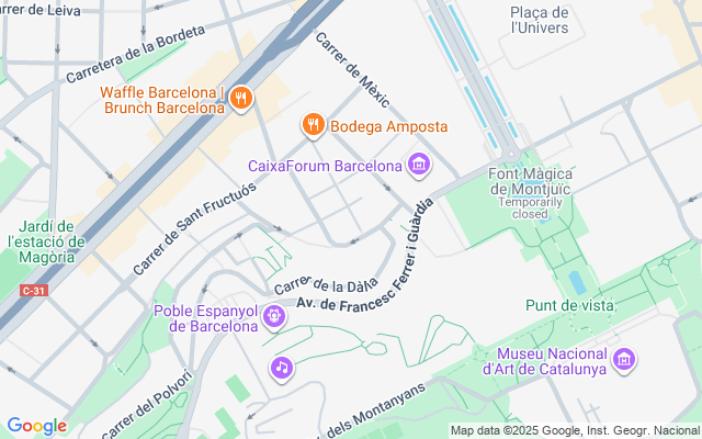 - Transporte: Varias líneas de autobús (Av. Ferrer i Guàrdia, Reina Maria Cristina, Pl. Espanya) y conexión con FGC y metro en Plaça Espanya.