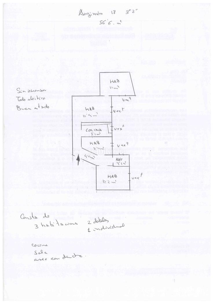 Tercer piso real, en finca sin asncesor, de 63m2 distribuidos en 3 dormitorios -2 dobles (de 12 y 11m2) y 1 indivudual de 7,4m2-, comedor de 12m2, cocina independiente y lavabo con plato de ducha. Todas las estancias son exteriores por lo que entra mucha luz natural en la vivienda.