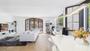 El amplio salón, lleno de luz natural, gira en torno a una chimenea de pellets y una cocina abierta totalmente equipada y hecha a medida.
