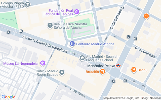 Metro: Menéndez Pelayo (L1) en la puerta. Tren y AVE: Estación de Atocha a 10 minutos andando.
