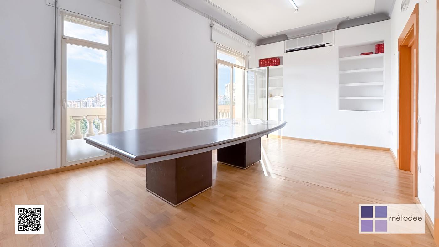 Espacio muy luminoso con vistas abiertas y una distribución funcional que combina zonas diáfanas con varios despachos independientes. Dispone de sala de reuniones, zona office y aseos. Destaca por sus techos altos, el pavimento de parquet y la presencia de balcones con vistas a Plaza Francesc Macià. Climatización frío/calor mediante splits y calefacción por radiadores.