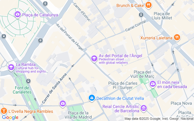 El espacio de 430 m², está situado en 2ª planta y goza de techos altos que aportan amplitud, gran luminosidad y carácter. Distribuido en 8 despachos, 2 baños (uno para empleados y otro para clientes) más cocina-office. Parte de los despachos dan a la calle, Porta de l'Àngel, mientras que otros tienen salida a amplio balcón-galería interior muy luminoso.