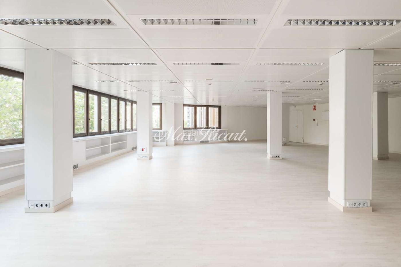 El espacio se presenta completamente diáfano, con grandes ventanales exteriores que inundan la oficina de luz natural y ofrecen vistas abiertas hacia la zona de Francesc Macià. Está equipada con sistema de climatización frío/calor, armarios empotrados y cableado técnico instalado, lista para empezar a trabajar.