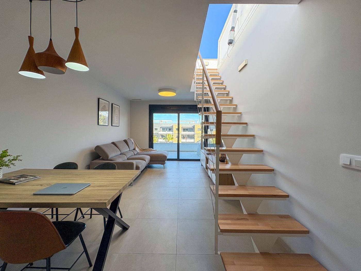 El salón es el espacio central del apartamento, con un planteamiento diáfano que permite diferentes configuraciones de mobiliario. La entrada de luz natural es constante gracias a los ventanales que dan acceso directo a la terraza principal, una superficie exterior que se integra con el salón y amplía la sensación de continuidad. En esta misma zona se encuentran las escaleras interiores que conducen al solárium privado, situado en la planta superior. El solárium ofrece una superficie amplia, sin obstáculos, y con posibilidades de uso variadas: zona de descanso, comedor exterior, espacio de almacenamiento de temporada o incluso una zona de trabajo al aire libre en días de buen clima. La altura respecto al resto del residencial proporciona una percepción clara de independencia.